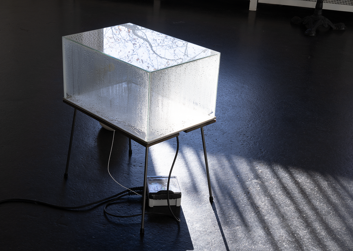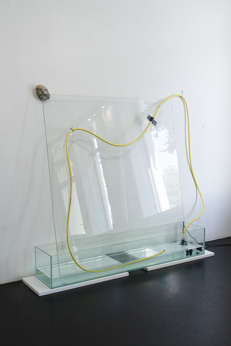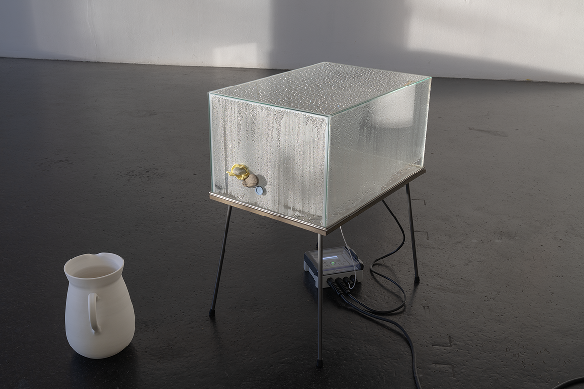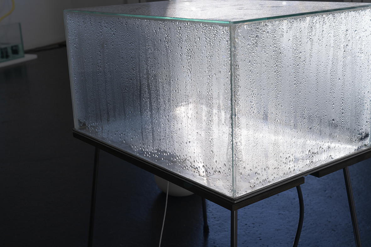 …L’une des œuvres s’intitule « Respire ! ». Elle se compose d’une boîte en verre ressemblant à un aquarium, d’une plaque chauffante et d’eau qui se transforme en vapeur blanche visible dans la boîte en verre. L’ensemble rappelle l’appareillage d’un laboratoire. Comme si l’on étudiait ici la transformation de l’eau d’un état physique à un autre : le cycle éternel de la pluie, de l’humidité, de l’évaporation, de la formation des nuages, …. Alice Henkes